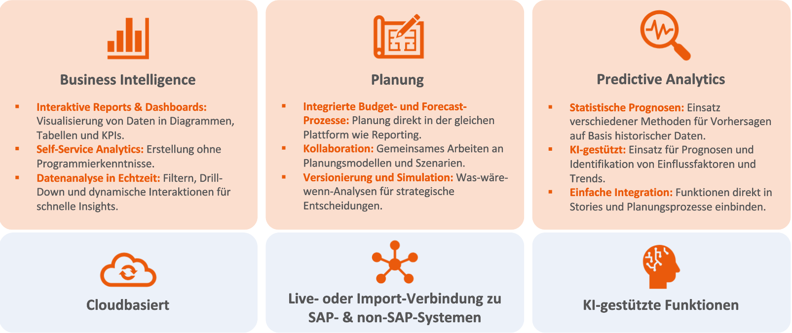 Besonders im Zusammenspiel mit SAP S/4HANA entstehen klare Vorteile. Datenbasis und Kennzahlen werden vereinheitlicht, Auswertungen klar visualisiert und Planungsprozesse direkt mit dem Tagesgeschäft verknüpft. Die folgende Übersicht zeigt, welche Funktionen die SAP Analytics Cloud in einer zentralen Plattform vereint.
